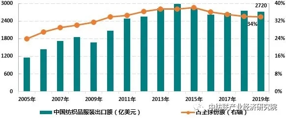 图1:我国纺织品服装出口金额及占全球份额