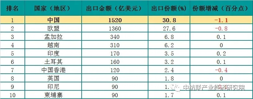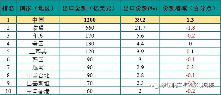 表1:2019年世界纺织品出口前10名