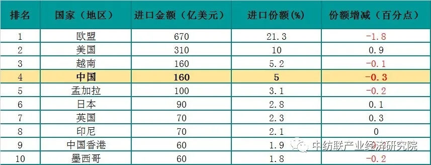 从纺织品和服装进出口前10位的国家和地区来看,各主要进出口国家及地区位次变化不大。越南、孟加拉、土耳其出口市场份额保持提升态势。美国进口份额提升,欧盟进口份额下降。