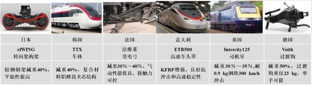 国外用于轨道交通装备上的纤维增强复合材料多为碳纤维或玻璃纤维增强复合材料,其也经历了从非承载结构到主承载结构的发展过程。典型的应用案例如:日本新干线N700系高速列车车体车顶、蒙皮、导电弓架边缘和窗框采用碳纤维增强复合材料;日本川崎重工开发的“efWING”转向架是全世界首例主承载结构采用碳纤维增强树脂基复合材料的案例,将原来刚性焊接转向架的构架改为柔性结构,减重达40%。韩国KTX-Ⅱ列车大量内装采用了复合材料,之后韩国TTX摆式列车车体采用碳纤维复合材料制作,重量降低40%。欧美在轨道交通车辆纤维增强复合材料进化过程中也做出了很多探索,如英国Intercity125机车、意大利ETR500型高速列车、法国的AGVgap动车组、美国佛罗里达州的单轨列车等都不同程度地使用了纤维增强复合材料作为车辆的内饰、主承载结构或次承载结构,减重效果良好,各种性能测试均达标。