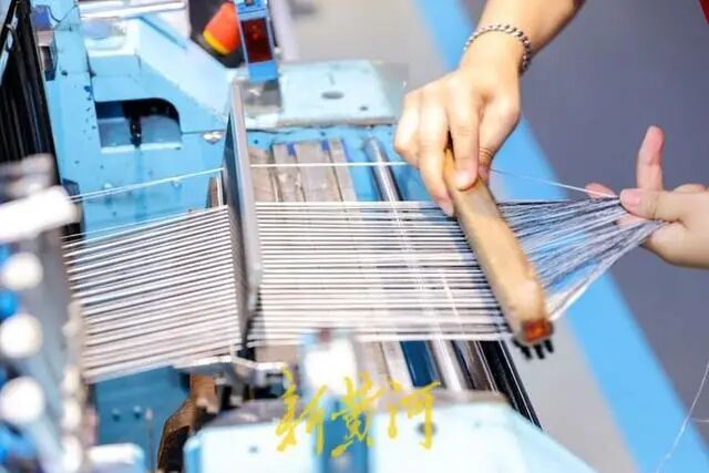 采访团在厂区内看到,干净明亮的车间里,数十台小型织造设备正在有条不紊地运转,每台机器右侧配有电脑,屏幕显示着图案纹样等数据,在左侧自动化“巧手”下,各不相同的面料小样在“一针一线”中逐渐成形。平均5天就能完成色纱制定、织造工段、整理检验等全部周期。